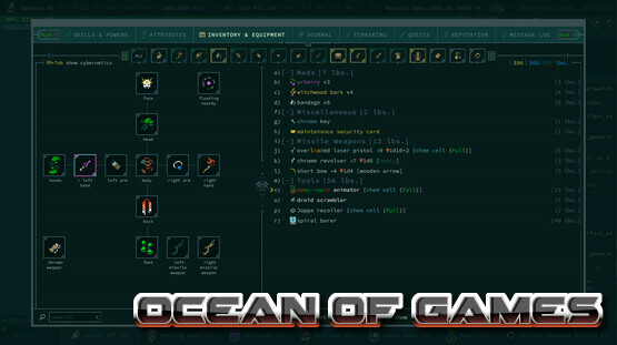 * Dozens of cybernetic implants (and more to find as treasure) night vision, translucent skin, carbide fists, spring-loaded ankle tendons
